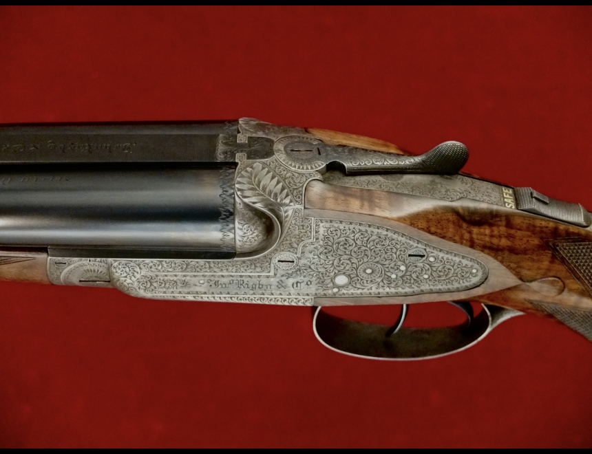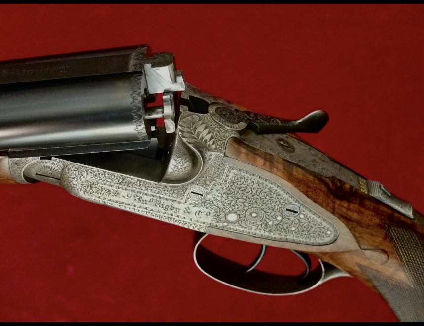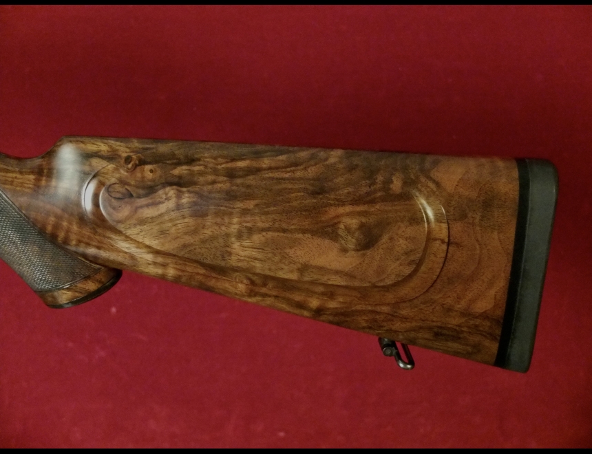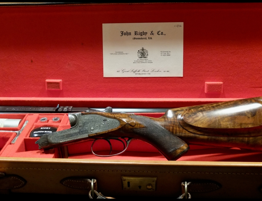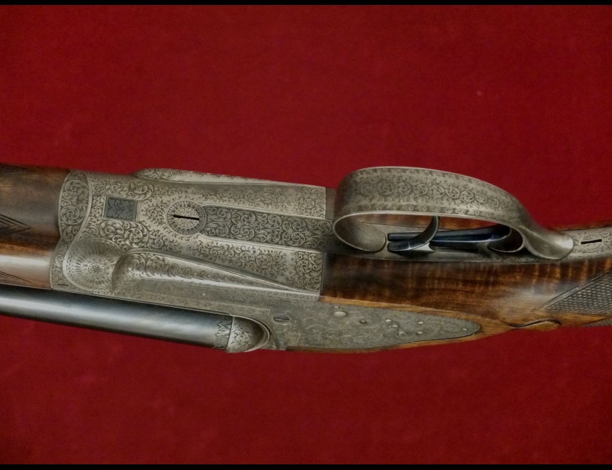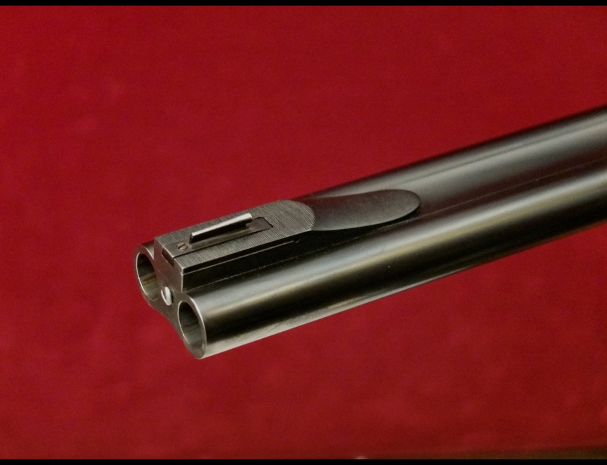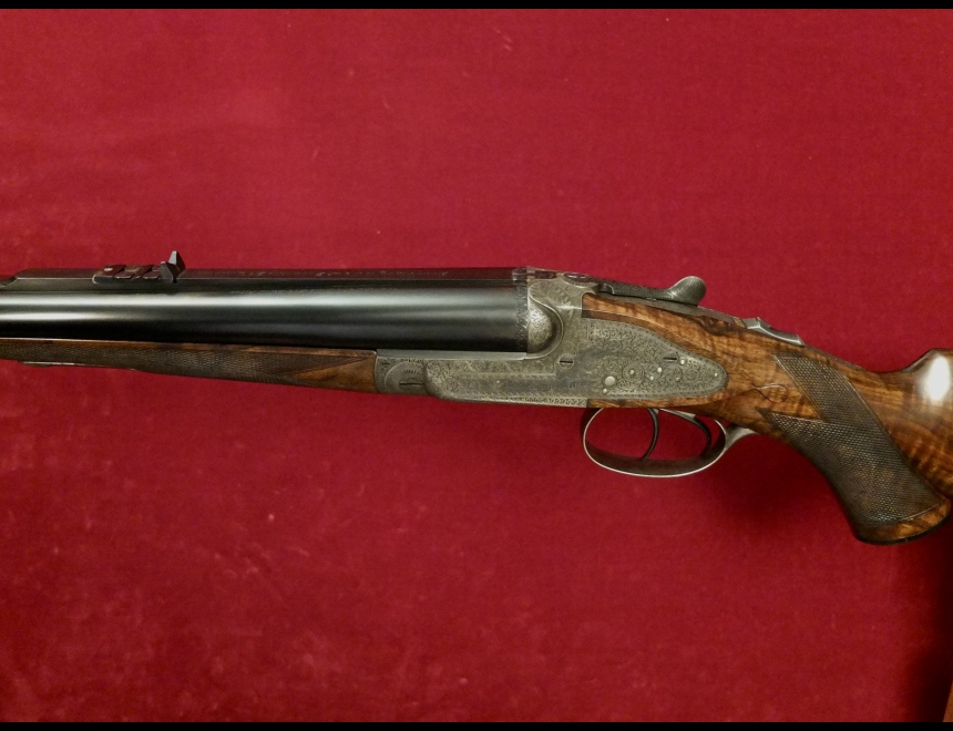 express sidelock, chiusura a testa di bambola, canne demibloc, tacche di mira abbattibili, calcio a pistola con guancialino e coccia in metallo